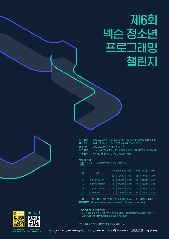 [자료제공 = 넥슨] 넥슨(대표 이정헌)은 오는 10월 30일 ‘제6회 넥슨 청소년 프로그래밍 챌린지 2021(Nexon Youth Programming Challenge, 이하 NYPC)’를 실시한다고 밝히고, 예선 일정과 진행 방식 등을 공개했다.