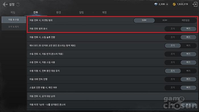 이때는 설정의 전투 카테고리, 자동 & 수동 탭에서 '자동 전투 범위 표시'를 켜주면 된다. 해당 설정을 켜놓으면 자동 전투 기능을 사용할 때 캐릭터가 행동하게 되는 범위를 잠깐 표시해준다.