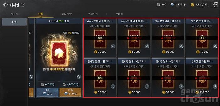 소환 카테고리에서는 아바타와 탈 것, 룬 등을 골드로 구매할 수 있는데, 아바타와 탈 것, 룬은 해당 골드 상품을 제외하고는 획득 경로가 제한적이며 유료로 구매하는 것이 일반적이기에 매우 중요하다.
