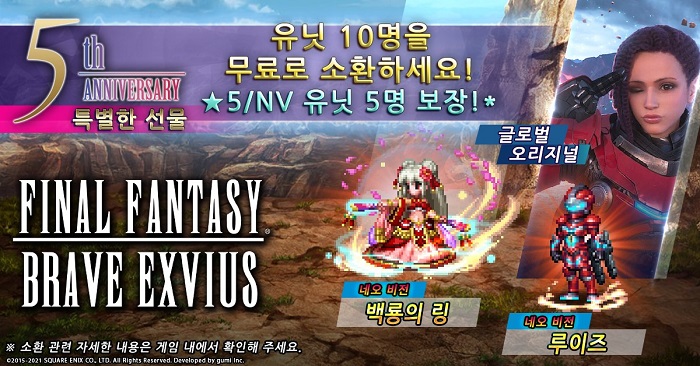 ‘파이널 판타지 브레이브 엑스비어스’는 글로벌 누적 다운로드 4천 5백만을 돌파한 인기 모바일 게임으로, 5주년 기념 프로모션을 통해 모든 이용자들을 위한 새로운 기간 한정 이벤트와 풍성한 게임 내 보상을 만나볼 수 있다. 또한, 팬들의 인기를 한 몸에 받아온 유닛들을 모아 특별한 5주년 기념 퀘스트 및 캠페인에 참여해 새롭고도 특별한 보상을 획득할 수 있다.