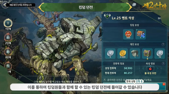 킹덤 던전은 킹덤 레벨 3이 되면 생성된다. 킹덤원들과 입장 가능하며, 개별 보상과 파티 보상이 모두 주어진다. 보스 전투를 중심으로 구성됐으며, 단합력이 필요할 것이다. 공략은 특정 속성을 맞추는 것이 유리하기 때문에 이마젠 조합 등을 연구해야 한다.