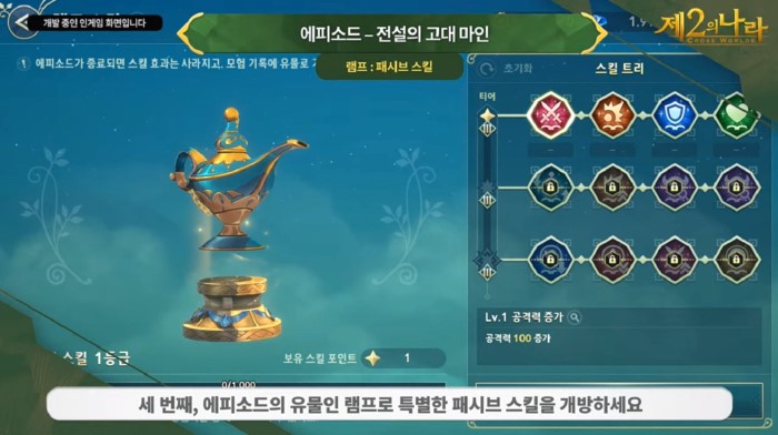 전설의 고대 마인 에피소드에선 전용 패시브 스킬인 '램프' 스킬을 사용할 수 있다. 램프를 통해 얻는 패시브는 별도의 경험치로 성장하는 스킬이다. 전투력 차이가 많이 나는 유저도 에피소드를 즐길 수 있도록 만든 편의성 기능이다. 에피소드가 끝나면 더 이상 사용할 수 없지만, 모험 기록에 기록되기 때문에 전투력 성장에 도움이 될 것이다.