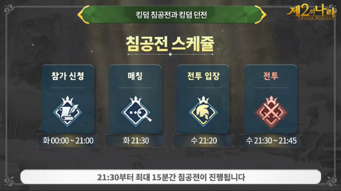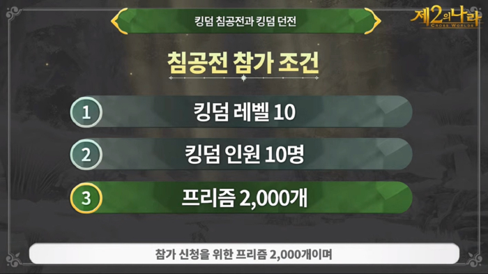 킹덤 침공전 참가 조건은 킹덤 레벨은 10, 킹덤 인원 10명, 프리즘 2천 개이며, 참가 신청은 화요일 0시부터 21시까지다. 화요일 21시 30분에 신청한 킹덤끼리 매칭 후, 수요일 21시 20분에 입장해 21시 30분 부터 15분 동안 전투를 진행한다.