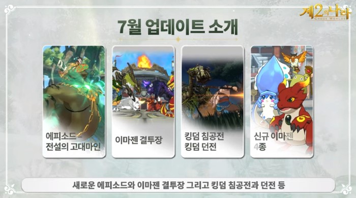 다음 코너는 7월 업데이트 내용을 미리 보는 '업데이트 미리보기!'다. 공개된 사항은 신규 에피소드 전설의 고대 마인, 이마젠 결투장, 킹덤 침공전과 킹덤 던전, 신규 이마젠 4종이다.