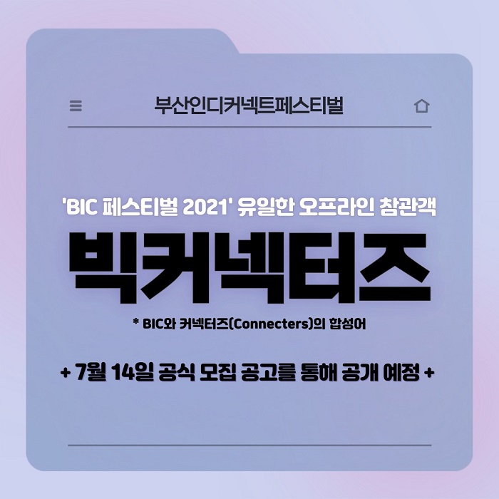 ‘BIC 페스티벌 2021’에서 처음으로 도입되는 크루 ‘빅커넥터즈’는 BIC와 커넥터즈(Connecters)의 합성어로, BIC와 인디게임 개발자, 게이머의 연결을 의미한다. 이들은 오는 9월 9일부터 11일까지 부산 이스포츠 아레나에서 진행되는 ‘BIC 페스티벌 2021’에 유일한 오프라인 참관객으로 활동하게 되며, 온라인과 오프라인 행사를 연결하는 구심점으로 활약할 예정이다. 또한, 빅커넥터즈에게는 BIC 페스티벌 2021 출품작을 가장 먼저 플레이할 수 있는 기회 등의 혜택이 주어진다.