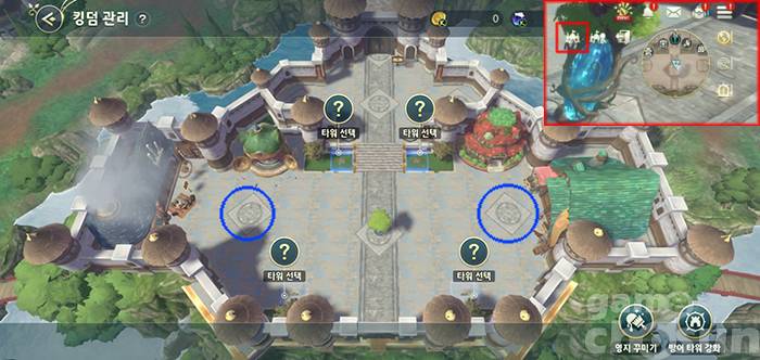미니맵 왼쪽 킹덤 아이콘 클릭으로 타워 배치 가능! 파란 부분은 로봇 배치 구역이다 = 게임조선 촬영
