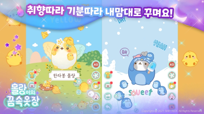 ‘몰랑이의 꿈속 옷장’은 향후 출시될 판타지 힐링 게임인 '몰랑월드'와 동일한 세계관 안에서 전개되는 게임으로 몽환적이고 판타지 동화적인 그래픽 풍의 몰랑이를 미리 만나보는 재미도 미리 추가로 경험할 수 있다.