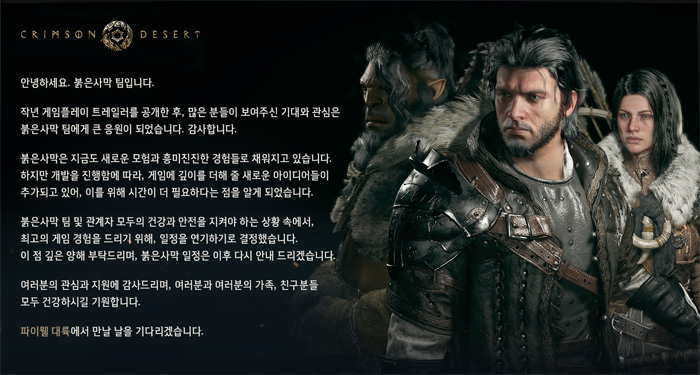펄어비스의 연말 기대작 '붉은사막'이 출시 일정을 연기한다고 발표했다.