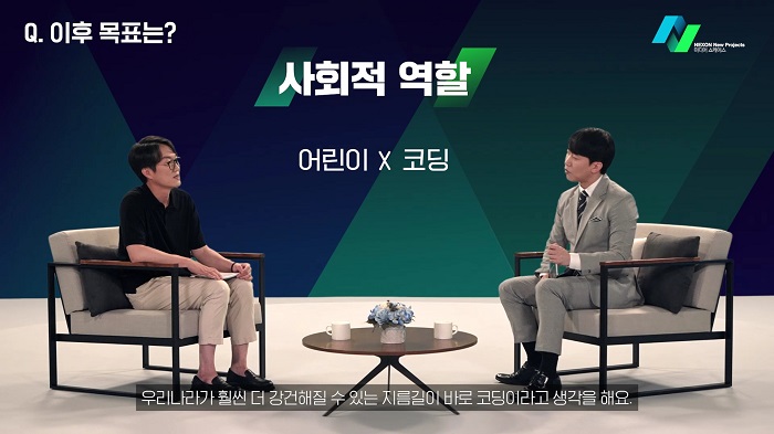 마지막으로 사회 공헌과 관련한 키워드는 두 가지를 꼽았다. 그 첫 번째는 어린이이며, 두 번째는 코딩이다. 넥슨은 어린이 재활병원 건립, 넥슨의 작은 책방, 미래를 책임질 어린이와 코딩을 주제로 하는 NYPC 등의 사회 공헌 활동을 펼쳐왔다. 넥슨은 코딩에 대해서 조금 더 많은 사람들이 쉽게 접하고 실력을 쌓아갈 수 있게끔 물심양면으로 지원을 아끼지 않을 것이라는 계획이다.