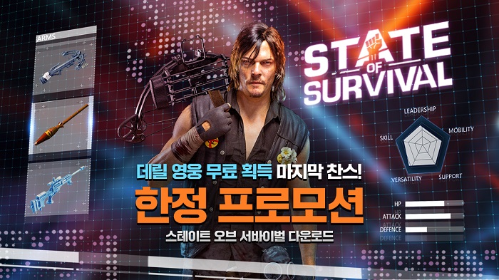 한편, 워킹데드와의 컬래버레이션 프로모션 2탄 워킹데드 홍보 영상 SNS 공유 이벤트와 관련한 자세한 내용 및 커뮤니티는 ‘S.O.S:스테이트 오브 서바이벌 공식 카페’에서 확인할 수 있다.