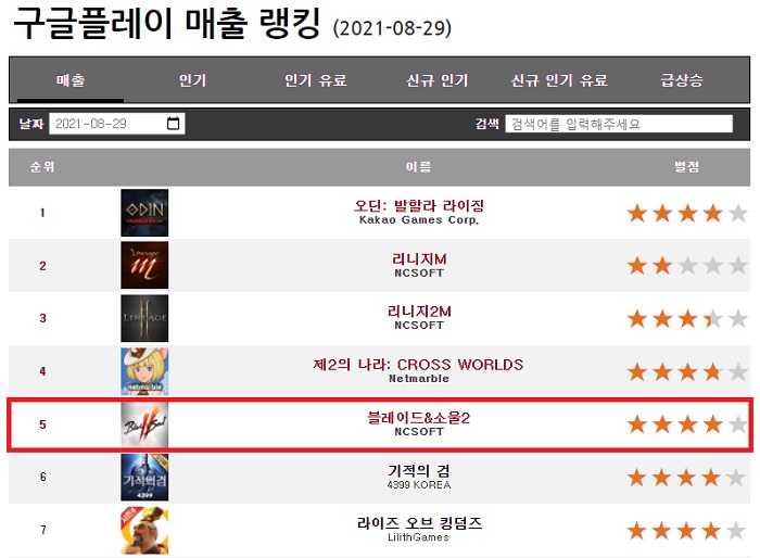 엔씨소프트의 신작 모바일 MMORPG '블레이드 앤 소울2'가 구글플레이 매출 순위 TOP 5 내 진입에 성공했다.