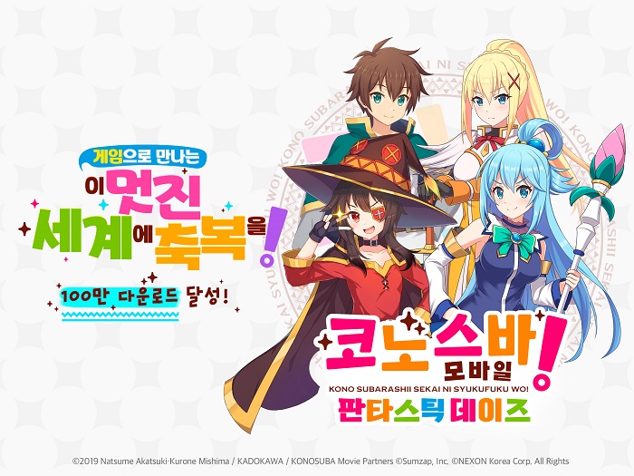 [자료제공 = 넥슨] 넥슨(대표 이정헌)은 31일 자사가 서비스하는 모바일 게임 ‘코노스바 모바일 판타스틱 데이즈(이하 코노스바 모바일)’에서 누적 다운로드 100만 돌파를 기념해 감사 이벤트를 진행한다고 밝혔다.