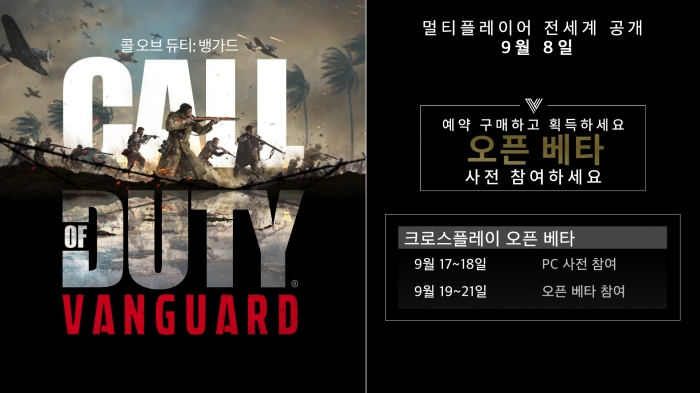 PlayStation®에서 뱅가드를 예약 구매한 팬들은 이번 주말 멀티플레이어 베타에 사전 참여할 수 있다. 이 기간 중에는 호텔 로얄(Hotel Royal), 레드 스타(Red Star) 및 가부투(Gavutu) 등 세 곳의 신규 전장, 팀 데스매치(Team Deathmatch), 점령(Domination) 및 확인 사살(Kill Confirmed) 등 세 가지 게임 모드, 그리고 신규 모드인 정찰(Patrol) 및 새 무기가 더해진 챔피언 힐(Champion Hill)을 체험할 수 있다.