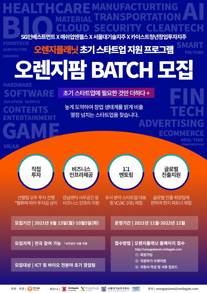 모집 대상은 정보통신기술(이하 ICT) 및 바이오 기반 전 분야의 창업을 준비하는 초기 창업 팀(법인 설립 3년 이내)이며 접수는 10월 5일까지 오렌지플래닛 홈페이지를 통해 진행된다. 오렌지플래닛은 1차 서류심사와 2차 인터뷰 및 PT 심사를 거쳐 총 5개 팀 내외의 초기 창업 팀을 최종 선발할 예정이다.