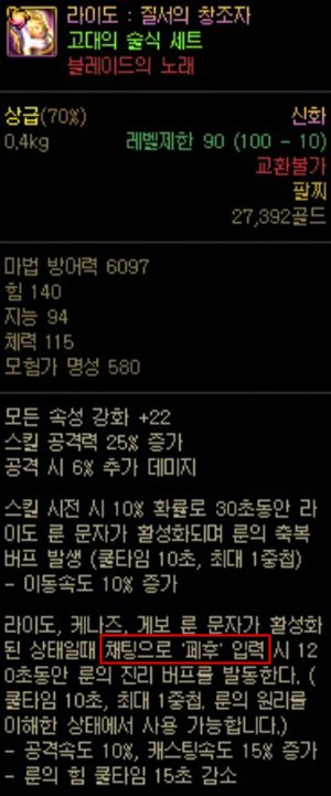 다음은 '던전 앤 파이터'에 등장하는 아이템 '고대의 술식' 세트입니다. 고대의 술식 세트는 '케나즈: 정신을 밝히는 불'과 '라이도: 이동의 규율', '게보: 완벽한 균형'으로 구성된 아이템으로 세 아이템 중 두 부위를 착용하면 채팅 입력 시 효과가 발동합니다. 그런데 고대의 술식 세트의 채팅 효과는 특이하게도 '룬' 이라는 문자를 사용합니다.