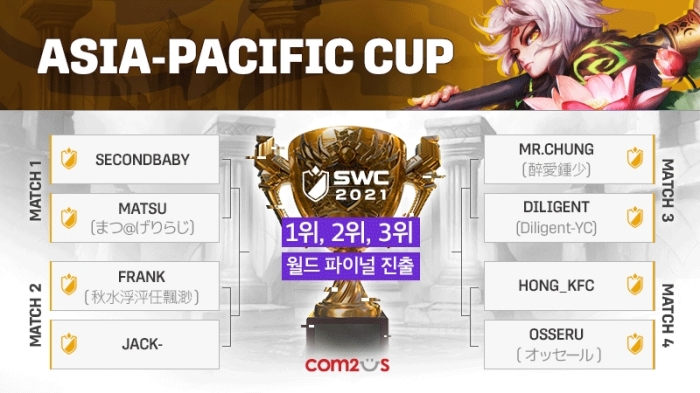 컴투스가 진행하는 ‘SWC2021’ 아시아퍼시픽컵에는 지난 A-D조 예선을 통해 선발된 8명의 선수가 출전해 총 세 장의 월드 파이널 티켓을 두고 실력을 겨룬다. 한국에서는 아시아퍼시픽 지역 A조 예선 1위로 진출한 ‘SECONDBABY’와 패자전 1위로 올라온 ‘JACK-‘이 참가해 월드 파이널을 향한 도전에 나선다.