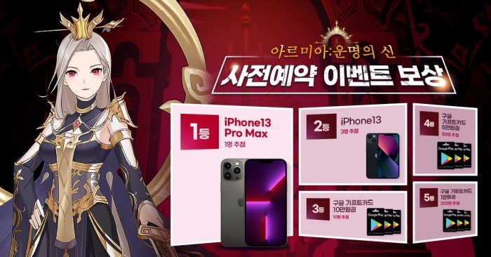이와 함께 진행되는 친구 초대 이벤트는 아르미아 사전예약 소식을 유저가 활용 중인 SNS에 공유한 다음, 이를 게임 공식카페에서 스크린샷으로 인증하면 모든 절차가 마무리된다. 회사 측은 추첨을 통해 최신 아이폰13 Pro Max, 구글 기프트 카드 등 푸짐한 경품을 선물할 예정이다.
