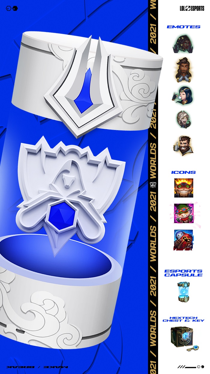 월드 챔피언십 보상 캡슐을 열면 2021년 월드 챔피언십 한정 감정표현과 아이콘, e스포츠 캡슐, 마법공학 상자와 열쇠가 주어진다. 캡슐에 들어 있는 감정표현이나 아이콘을 이미 보유하고 있을 경우 해당 아이템은 파랑 또는 주황 정수로 바꿀 수 있다.