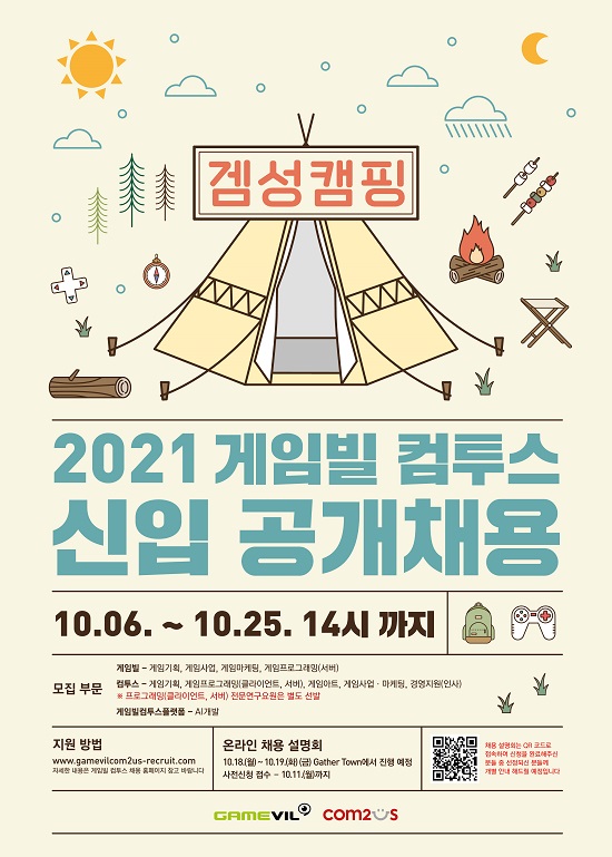 한편, 게임빌-컴투스는 오는 18일과 19일 양일간 메타버스를 활용한 온라인 채용설명회를 진행한다. 양사는 감성과 게임을 합친 ‘겜성 캠핑’을 이번 채용의 슬로건으로 정하고, 캠핑 콘셉트에 맞춰 메타버스에 신나는 캠핑장을 구현했다. 지원자들은 온라인 캠핑장에서 즐거운 시간을 보내고, 동시에 원하는 채용 정보를 찾아 나설 수 있다. 또한 현직자들이 참여해 직무별 라이브 상담을 진행하며, 인사 담당자에게 궁금한 점을 직접 문의할 수 있는 온라인 채용 부스도 마련될 예정이다.