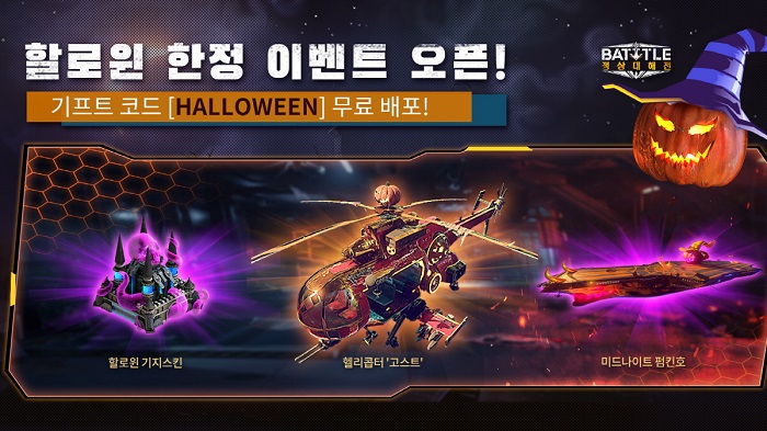 이용자는 이벤트 기간 동안 핼러윈 아이템인 ‘핼러윈 캔들’과 ‘고스트 캔디’를 사용해 ‘마법 호박’을 업그레이드할 수 있으며 신규 헬리콥터 ‘고스트(Ghost)’ 계열, 기지 주둔스킨 ‘유령 성’, ‘사탄 성’, 오라 ‘미드나잇 나이트메어’ 등 희귀 아이템들을 얻을 수 있다. ‘핼러윈 캔들’과 ‘고스트 캔디’는 게임 내 활약 이벤트 ‘해적 처치’, ‘강군 훈련’, ‘전술 지휘소’ 등을 통해 획득할 수 있고, 10월 23일(절기·상강 霜降), 10월 31일(핼러윈 이브) 축하카드와 함께 2회에 걸쳐 무료로 배포한다.