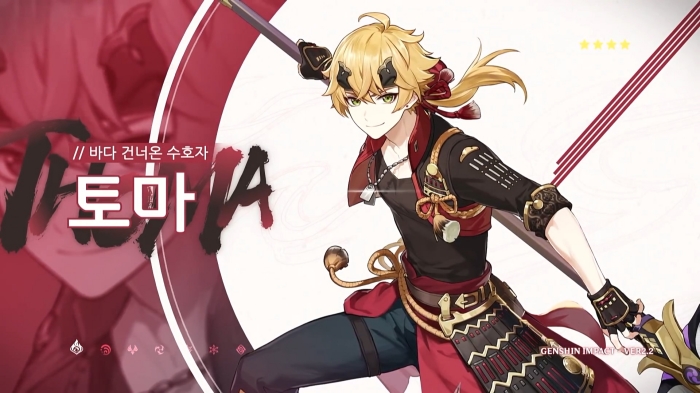 2.2 업데이트 기간 중 '바다 건너온 수호자 · 토마'가 참전한다. 장병기를 사용하는 불 원소 4성 캐릭터로 불 원소에선 드물게 방어적인 서포터형 캐릭터로 원소 전투 스킬로 방어막을 생성하고 원소 폭발로 또 한 번 덧씌우는 방어막 계통의 서포터다.