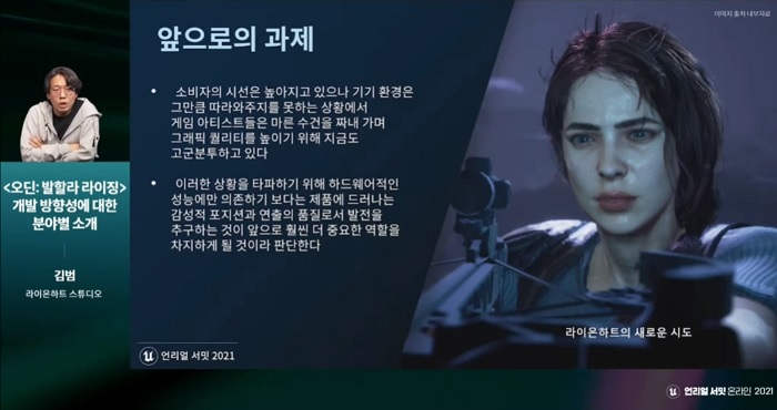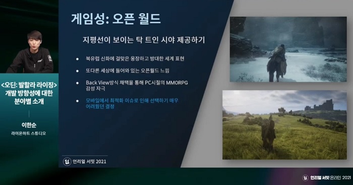 언리얼 서밋 온라인 2021의 2일차인 13일에는 오딘: 발할라 라이징의 핵심 개발자 3인방인 라이온하트 스튜디오의 이한순 PD와 김범 AD, 김재섭 클라이언트 팀장이 자리해 오딘: 발할라 라이징의 세계관 및 MMORPG로서 추구했던 개발 방향성 및 개발 과정에 대해서 자세하게 소개했다.