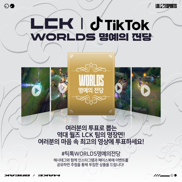 틱톡을 통해 진행되는 이번 이벤트는 2012년부터 2020년까지 LCK 팀들이 월드 챔피언십에서 선보인 명장면들을 하루에 하나씩 선정하는 방식으로 진행된다. 10월 22일부터 24일까지 틱톡을 통해 16강 투표를 진행하며 25일에는 8강, 26일에는 4강, 27일에는 결승을 투표한다. 결과는 28일 발표된다.