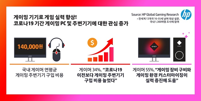 HP는 한국 게임 시장의 변화에 대해서도 조사를 진행하면서 게이밍 시장 공략에 나선다. 팬데믹의 도래로 인해 게임의 긍정적인 반응이 두드러지게 나타났는데, 응답자 73%가 코로나 19로 인해 스트레스를 풀기 위해 게임을 즐겼다고 밝혔으며, 응답자의 60%가 팬데믹 기간 동안에 게임을 통해 친구 혹은 가족과 소통했다고 전했다.