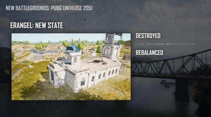 배틀그라운드: 뉴스테이트에서는 오리지널 맵인 트로이 외, 에란겔도 만나볼 수 있다. 에란겔은 배틀로얄 경기와 방치로 인해 일부 파괴된 모습으로 등장하며 해당 맵의 정체성은 유지하면서도 일부 기존 비인기 지역은 리밸런싱 및 보강 작업을 진행했다. 에란겔은 업데이트를 통해 점차 2051년에 개척되는 모습으로 조금씩 변모해나갈 예정이다.