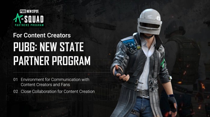 이외에도 게임을 중심으로한 수많은 콘텐츠를 제작해 커뮤니티 조성, 발전에 기여하는 크리에이터와 동반 성장을 도모하려는 계획도 언급했다. 단기적으로는 배틀그라운드: 뉴스테이트만의 파트너 프로그램인 'A-SQUAD'와 '명예의 전당'을 구축하고 이를 이용자 커뮤니티의 소통 창구로 발전시켜나갈 예정이다. A-SQUAD는 함께 콘텐츠를 제작하고 이를 통해 팬과의 소통이 이뤄지도록 하고, 게임-콘텐츠-플레이어 사이의 유대감을 증대시켜 고유한 커뮤니티 문화를 만드는 것을 목표로 한다.