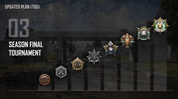 배틀그라운드: 뉴스테이트는 크게 8단계의 티어 시스템으로 구성돼 있으며 두 달 동안의 한 시즌이 진행된 후에 소프트 리셋되는 방식으로 운영된다. 정식 론칭 후 최초 두 달은 프리 시즌으로 치뤄지며 향후 업데이트를 통해 최상위 티어 이용자들은 시즌 종반에 온라인 토너먼트에 참가할 자격을 부여받게 되며 리전별 최종 우승자 혹은 우승팀에는 큰 명예 보상을 지급할 예정이다.