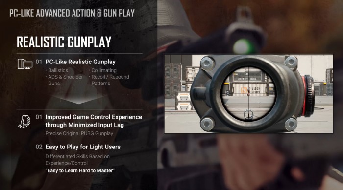 건플레이의 경우 배우기는 쉬우나 마스터하기는 어려운 방향으로 설계했는데, 배틀로얄 게임을 처음 접하는 플레이어도 쉽게 적응할 수 있지만 건플레이 숙련도와 컨트롤에 따라 실력 격차가 발생하도록 디자인한 것이다. PC 배틀그라운드의 캐릭터 애니메이션과 물리 효과 또한 모바일 환경에서 그대로 구현했으며 모바일에서는 불가능했던 창문 파괴, 문 부분 파괴, 차량 문 파괴, 천 관통, 부서지는 장애물 등 여러가지 물리효과를 물리엔진 최적화를 통해서 모바일에서 실현 가능하도록 했다.