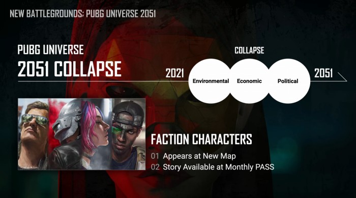 마지막으로 네 번째 특징으로는 PUBG의 세계관을 계승해 배틀그라운드 이후 2051년 뉴스테이트의 새로운 세계관을 선보이는 것을 꼽았다. 2051년 중앙정부의 통제력이 상실된 무정부 상태의 무너진 미래를 배경으로 다양한 세력들이 갈등을 벌이고 있는 트로이라는 도시가, 의문의 집단의 침략으로 배틀로얄의 격전지가 되는 것이 배틀그라운드: 뉴스테이트의 시놉시스다.