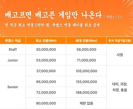쿡앱스 박성민 대표는 이번 인재 채용과 관련해 “배고프면 ‘배고픈 게임’만 나온다는 슬로건으로, 대기업에서만 상위 연봉을 받을 수 있다는 편견을 깨고 싶었다”라고 설명하며 “모든 임직원에게 최고의 환경을 선사하고, 동등한 조건에서 유저를 위한 더 재미있는 게임 개발에 몰두할 수 있는 환경을 제공하기 위한 선택이다.”라는 메시지를 전하며, 개발 직군, 비개발 직군을 가리지 않고, 전 직군 최소 연봉 5,000만 원부터 시작되는 구체적인 연봉 테이블 가이드 라인도 전격 공개했다.