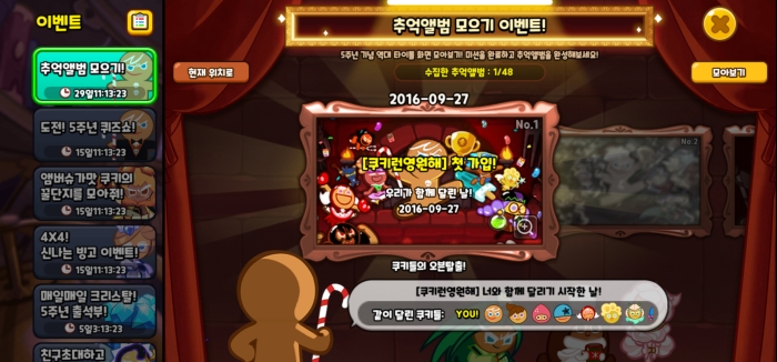 뿐만 아니라 각자 쿠키런: 오븐브레이크를 처음 시작한 지점에서부터 타이틀을 하나씩 모아보는 추억앨범 이벤트로 소소한 감동을 전하고, 5주년 퀴즈쇼를 통해 깨알 재미를 선사한 것 역시 좋은 반응을 얻고 있다.