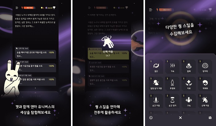 ‘덴마 유니버스’는 네이버웹툰 원작 '덴마'를 재해석한 독창적인 스토리로 진행되는 텍스트 어드벤처 게임으로 지난해 ‘네이버웹툰 게임 챌린지 2020' 공모전 9위에 선정됐다. 주인공은 '덴마'가 아니며, '카피 퀑'이라는 숙명을 지고 태어난 주인공은 우주 물류 배송업체 실버퀵에 납치되어 영문도 모른 채 수많은 행성을 떠돌며 택배를 배송해야 한다. 덴마 IP를 사용한 게임이니만큼, 덴마, 이델, 야와, 제트 등 다양한 원작 속 인물들을 만나고 상호작용할 수 있는 것이 특징이다.