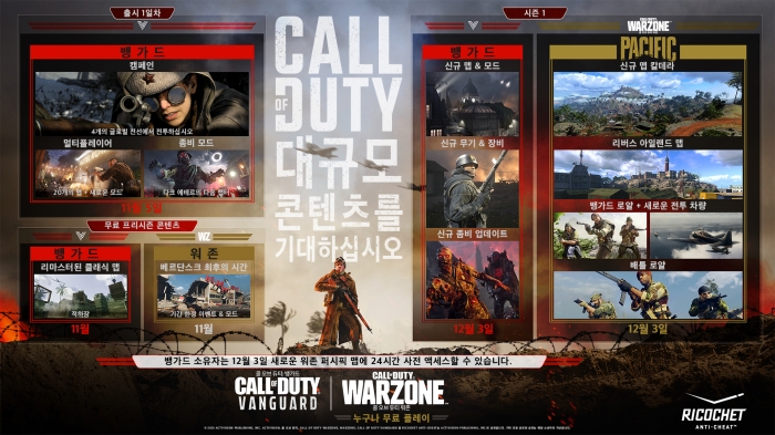 - 부정 행위 근절을 위한 강화된 보안 장치: 콜 오브 듀티: 뱅가드 출시와 함께 부정 행위와 싸우기 위해 개발된 다면적인 접근 방식, PC RICOCHET Anti-Cheat가 적용된다. RICOCHET Anti-Cheat는 추가 다운로드가 필요하지 않으며, 게임 플레이와 함께 자동으로 실행된다. 뱅가드는 출시 당일부터 모든 멀티플레이어 게임플레이를 면밀히 살펴 의심스러운 행위를 식별할 예정이다.