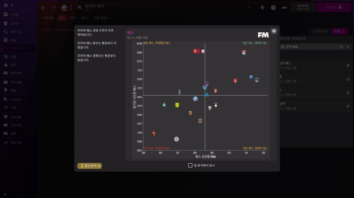 그리고 새롭게 추가된 데이터 센터는 팀에 관한 모든 데이터와 퍼포먼스 분석 자료를 제공하여, 팀의 모든 부분을 직관적으로 체크할 수 있게 되었다. 특히, 해당 기능을 개발할 때 실제 구단이 사용하는 같은 방법론과 리포팅 체계를 차용하여 FM에서도 실제 구단이 분석하는 것과 같은 방식의 자료를 볼 수 있게 되었다.