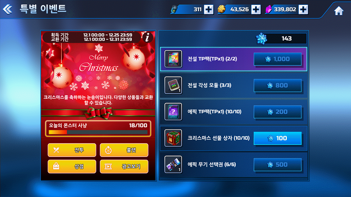 먼저 12월 1일부터 크리스마스 당일인 12월 25일까지 다양한 인게임 아이템 획득 기회를 제공하는 ‘크리스마스 눈송이 이벤트’를 실시한다. 이벤트 기간 동안 일반 모드에서 몬스터를 처치하거나 광고 시청, 룰렛, 상품 구매 등을 통해 ‘눈송이’ 아이템을 수집할 수 있으며, 이벤트 페이지에서 전설TP팩이나 에픽TP팩, 각성 모듈, 크리스마스 선물 상자 등 다양한 아이템으로 교환 가능하다.