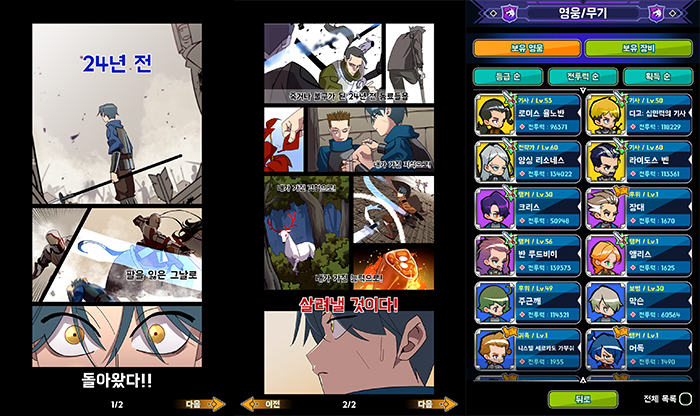 원작 속 주인공의 소중한 동료들 뿐만 아니라 적대적인 영웅들도 동료로 영입할 수 있다. 64종의 영웅과 75종의 무기가 준비되어 있고 던전과 파견으로 무과금 유저도 영웅과 무기를 수집할 수 있게 했다.