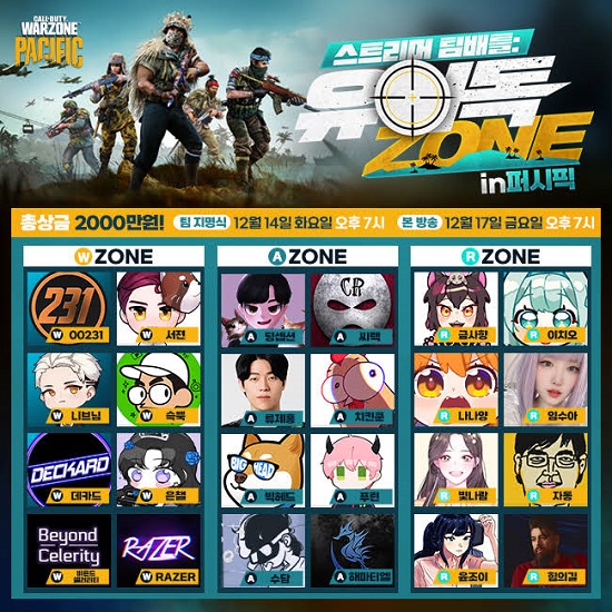 오늘 12월 17일 저녁 7시에는 태평양 컨셉의 새로운 전장, 칼데라(Caldera)로 배경을 옮긴 워존 퍼시픽에서 인기 스트리머들이 모여 생존 경쟁을 펼치는 스트리머 팀배틀: 유아독ZONE 인 퍼시픽(이하 유아독ZONE) 대회가 트위치, 유튜브를 통해 생중계된다.