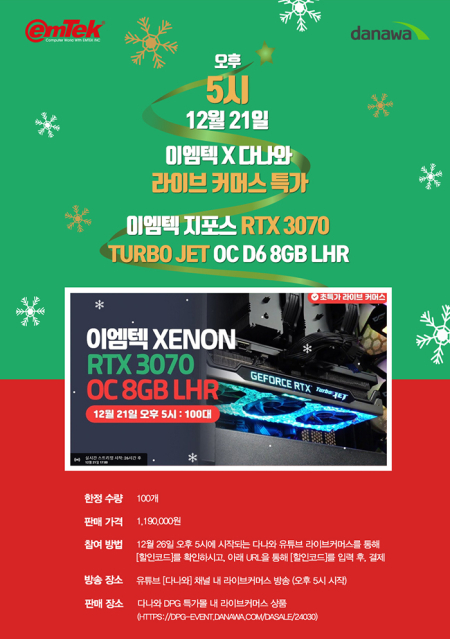 다나와 라이브 커머스 방송은 12월 21일 오후 5시부터 시작되며, 라이브 방송에서 노출되는 할인 코드를 확인하고, 다나와 DPG 특가몰 내 이엠텍 지포스 RTX 3070 TURBO JET OC D6 8GB LHR 라이브커머스 상품 판매 페이지에 할인 코드를 입력한 후, 구매하면 된다.