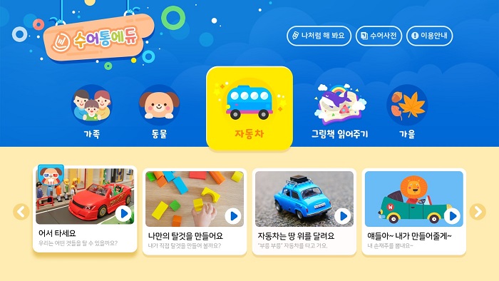 청각장애인 아동이 있는 가정일 경우, TV셋탑박스를 활용하여 거실에서 자녀와 함께 재미있는 그림책도 볼 수 있고, 표준교육과정에 맞춘 총 50편의 다양한 교육영상을 보며 자연스럽게 수어를 익힐 수 있다. 또한 농아동 부모님을 위한 가이드 영상도 수록되어 있어 유용하게 활용하면 된다.