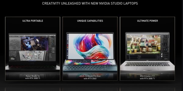 많은 시스템이 새로운 지포스 RTX 3080 Ti 노트북(laptop) GPU를 탑재할 예정이며, 이로써 플래그십 80 Ti 급 성능이 모바일 PC에 최초로 제공된다. 해당 GPU는 노트북에서 가장 빠른 16GB GDDR6 메모리 및 데스크탑용 타이탄(TITAN) RTX보다 높은 성능을 제공한다. 가격은 2,499달러부터 시작한다.