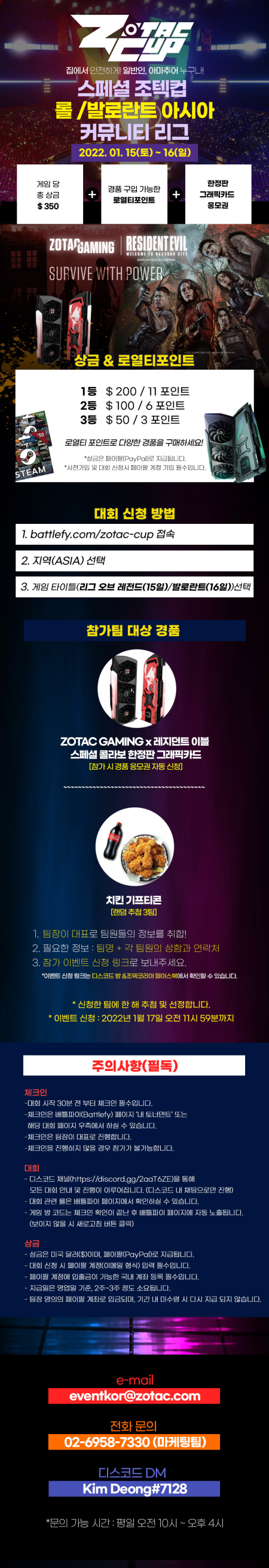 ‘스페셜 조텍컵’은 ZOTAC과 영화 ‘레지던트 이블 : 웰컴 투 라쿤 시티’의 콜라보레이션을 축하하며 특별 진행된다. 이 ‘스페셜 조텍컵’은 상금 뿐 만 아니라, 한정판 ‘조텍 게이밍 지포스 RTX 3070 Ti 그래픽카드’도 증정한다. 각각의 조텍컵에 참여할 때 마다 개인마다 1개의 티켓이 주어지며, ‘스페셜 조텍컵’이 끝나는 2022년 1월 16일 랜덤으로 3명을 추첨한다. 당첨된 참가자에게는 ‘레지던트 이블 : 웰컴 투 라쿤 시티’ 콜라보 한정판 그래픽카드를 증정한다.