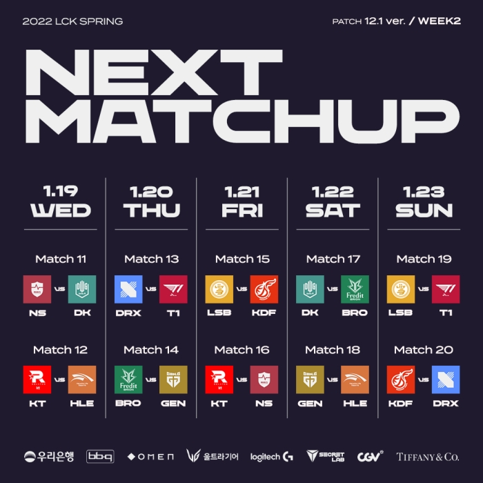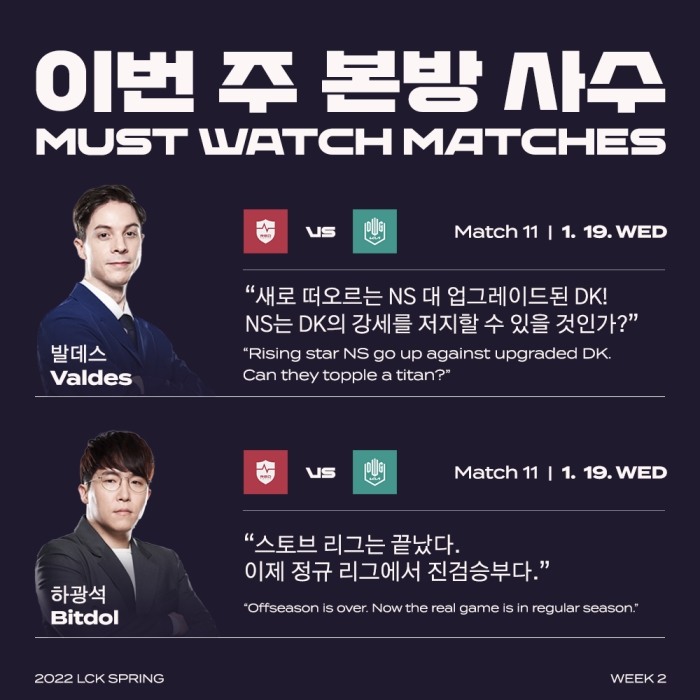 '리그 오브 레전드(LoL)' e스포츠의 한국 프로 리그를 주최하는 리그 오브 레전드 챔피언스 코리아(대표 오상헌, 이하 'LCK')는 19일(수)부터 23일(일)까지 서울 종로구 그랑서울에 위치한 LCK 아레나에서 2022 LCK 스프링 2주차가 진행된다고 밝혔다.