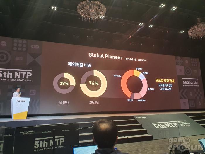 2016년 제2회 NTP에서 발표한 해외 매출 비중이 28%였지만, 2021년엔 74%, 올해는 80%까지 상승할 것으로 예측했다. 해외 매출 비중은 북미가 44%까지 늘어나고 있으며, 한국 매출 비중이 줄어들고 있다. 넷마블 내부적으론 성공 확률이 낮은 해외 공략보단 국내 서비스에 대한 니즈가 많은 상황이지만, 국내 게임 시장엔 국내 시장을 대상으로 출시하는 게임이 많은 만큼 해외 공략을 계속하고 있다. 이를 위해 글로벌 대표를 선임하는 한편 해외 게임사를 인수하며 글로벌 역량을 확대하고 있다. 넷마블게임의 80% 이상이 글로벌을 타깃으로 개발되고 있다.
