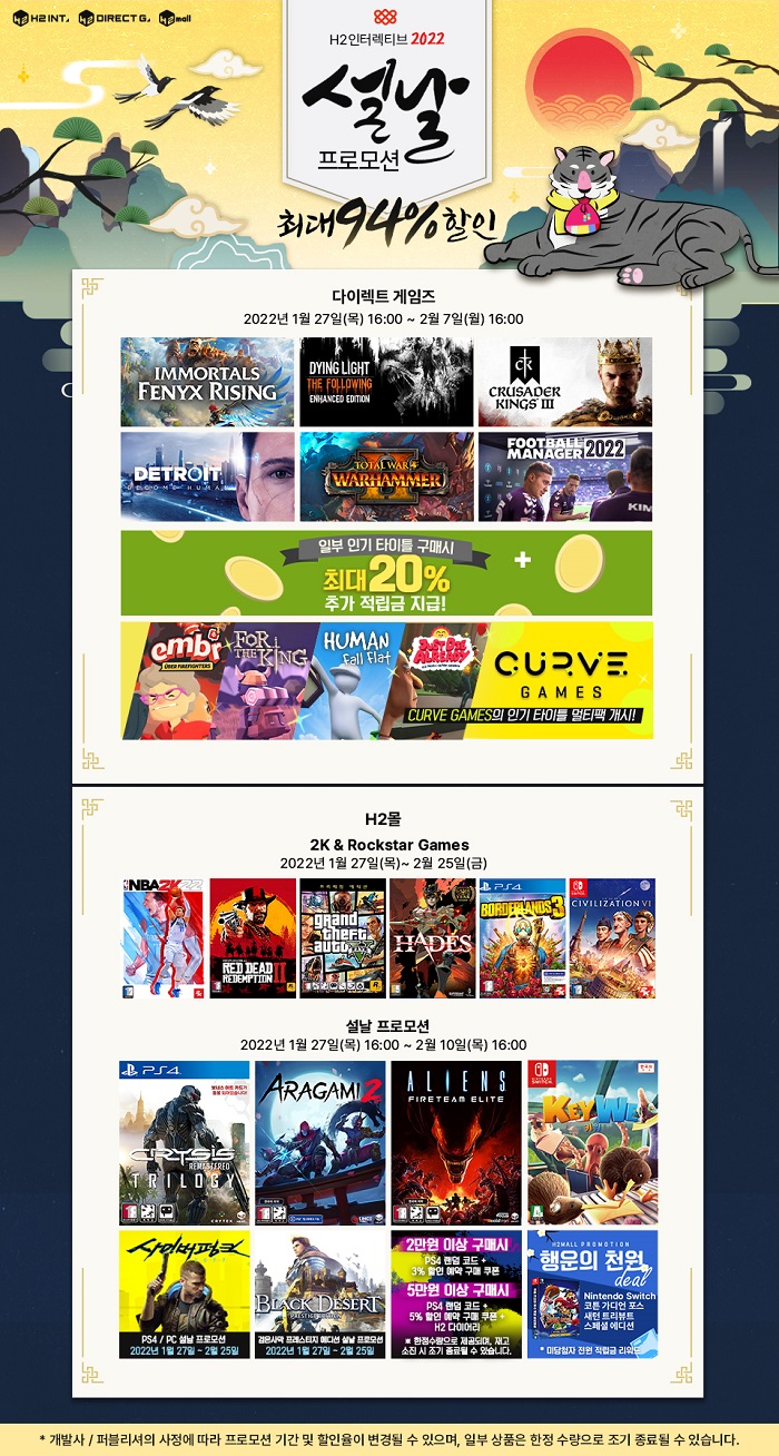 다이렉트 게임즈에서 진행되는 이번 프로모션은 2월 7일까지, H2몰에서는 2월 10일까지 진행된다. 프로모션 기간 중에는 신작 및 인기 게임을 최대 94% 할인된 가격에 구매할 수 있다.