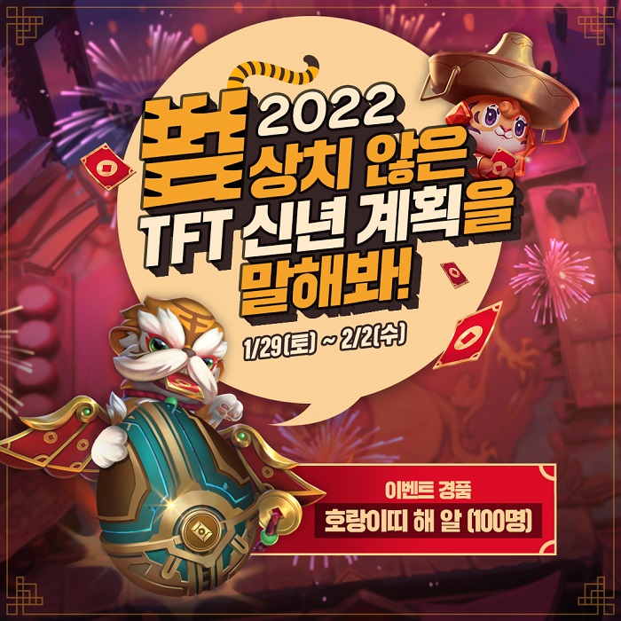 TFT는 1월 29일부터 2월 2일까지 공식 페이스북에서 “2022 범상치 않은 TFT 신년 계획을 말해봐” 이벤트를 진행한다. 이벤트 공지글에 신년 TFT 계획을 댓글로 달아 공유하는 방식으로, 참가자 중 100명을 추첨해 ‘호랑이띠 해 알’ 1개를 증정한다.