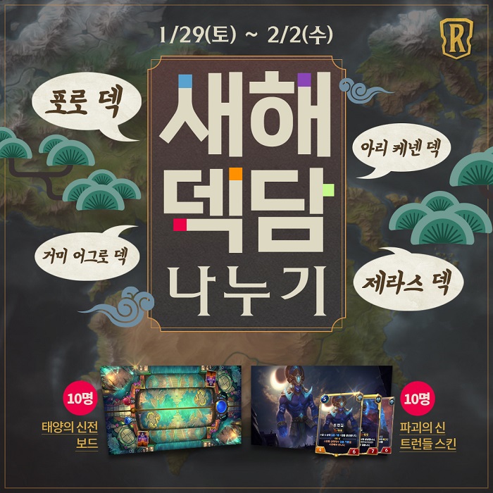 LoR의 공식 페이스북에서도 ‘새해 덱담 나누기’ 이벤트가 진행된다. 이벤트 기간은 1월 29일부터 2월 2일까지이며, 이벤트 안내문에 ‘룬테라에서 장수할 것 같은 나의 최애 덱’을 댓글로 달면 20명을 추첨해 ‘태양의 신전 보드’와 ‘파괴의 신 트런들 스킨’을 각 10명씩 증정한다.